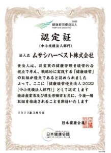 ムサシハーベスト株式会社は、経済産業省と日本健康会議が運営する健康経営優良法人認定制度において、「健康経営優良法人2022(中小規模法人部門)」に認定されました。