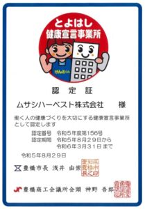 従業員の健康づくりに積極的に取り組み、健康経営を実践する事業所として「とよはし健康宣言事業所」に認定されました。